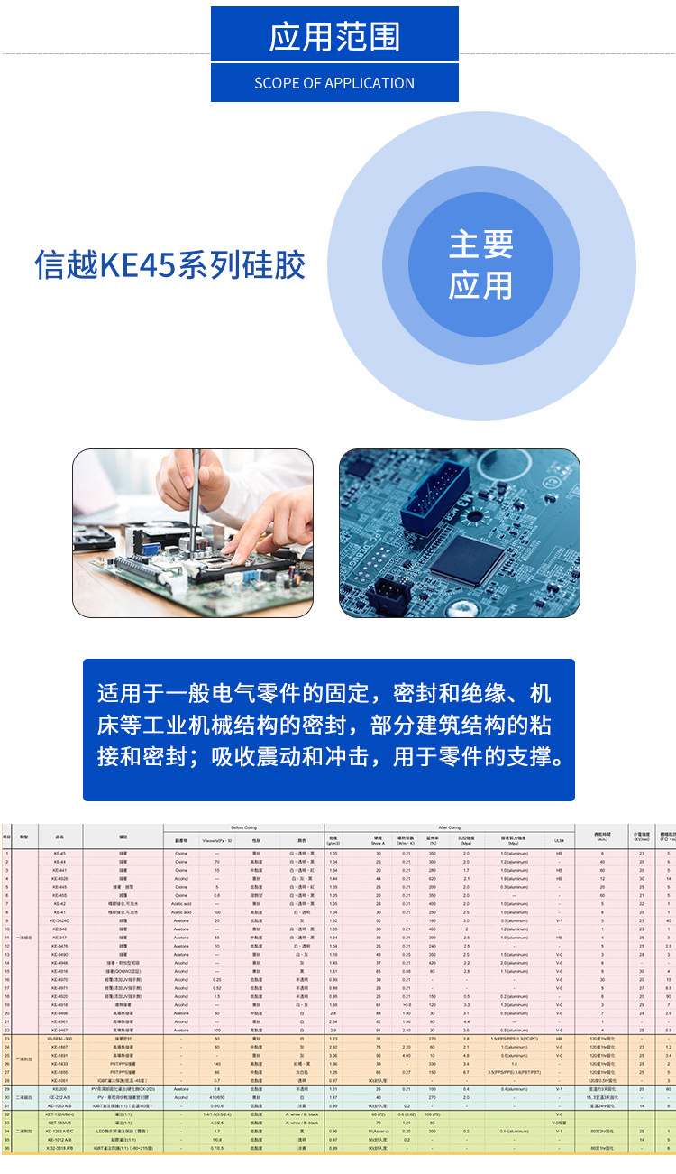 日本信越ShinEtsu: 接著及密封RTV橡膠:1. 一般電氣用(KE-348、KE-347、KE-45、KE-44、KE-441、KE-4897),2. 難燃性(UL合格品)(KE3490、KE3494、KE40、KE4890), 3. 導熱性(KE3493、KE4560),4. 超耐熱性(KE3418、KE3417),5. 導電性(KE3491、KE3492),6. 耐油劑及溶劑性(FE123、FE61),7. 塑膠用(KE4525、 KE4805),8. MIL合格品(KE3498、KE3497),9. 快速硬化用(KE1820、KE1830),10. 一般工業(yè)用(KE42、KE41) 。披覆膠:1.一液型有機硅灌封膠(KE1842、KE1056)。灌封膠:1.一液型有機硅灌封膠(KE1842、KE1056),2. 二液型有機硅灌封膠(KE1204B、KE1204BL-A、、KE1800). 硅油: KF-69、KF-96、KF-99硅油。散熱膏(導熱膏)及潤滑脂、阻尼油、真空密封脂:X-23-7783D、X-23-7762、G-751、G-747、G-746、G-501、G-330、G-332、G-353、G-633、KS-64、KS-612、KS-609、G-30M、G-40M、HIVAC-G